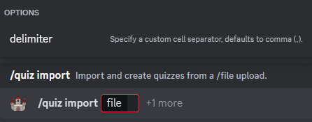 You can also specify a custom delimiter if your file is not using commas as separators, if not specified, commas will be used.  This is sometimes useful to change if you have values in your quiz which requires commas.&#x20;