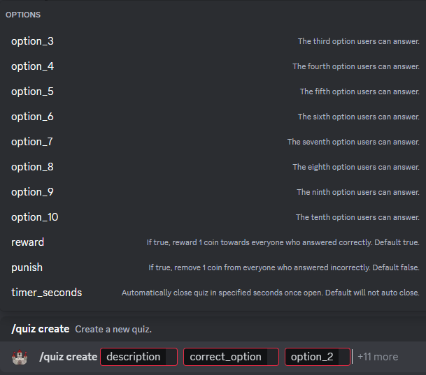 Create a new quiz with up to 10 options. Specify a correct option. All options are randomized before presenting to user. Created quizzes are not shown to users until they are opened.